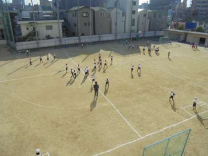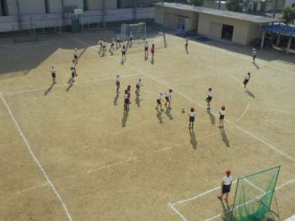 運動場で、サッカーをしています。温かい日差しが嬉しかったですね。