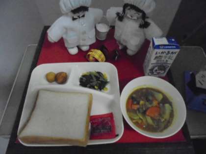今日の献立は、豚肉と野菜のカレー煮、ほうれん草のソテー、あげポテトもち、パン、牛乳です。
