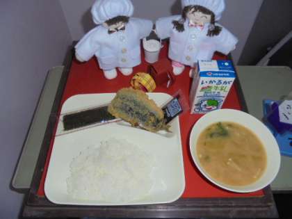 今日の献立は、いわしのフライ、みそ汁、焼きのり、ごはん、牛乳です。
