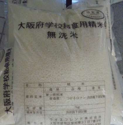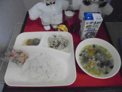 今日の献立は、豚肉と野菜のいためもの、すまし汁、きな粉よもぎだんご、ごはん、牛乳です。お米は、青森の「つがるロマン」です。