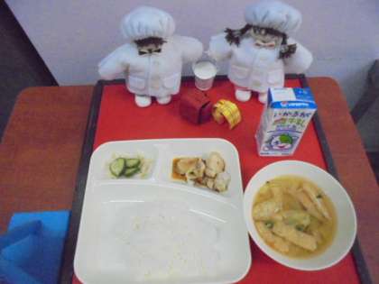 今日の献立は、焼きとり、みそ汁、きゅうりともやしのゆずの香あえ、ごはん、牛乳です。