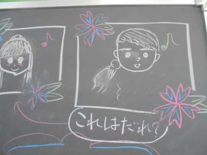 (上)教室後ろの黒板にありました。さて、だれでしょう?