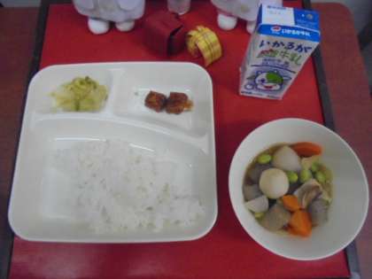 今日の献立は、まぐろのオーロラ煮、さといもと野菜の含め煮、キャベツの梅風味、ごはん、牛乳です。