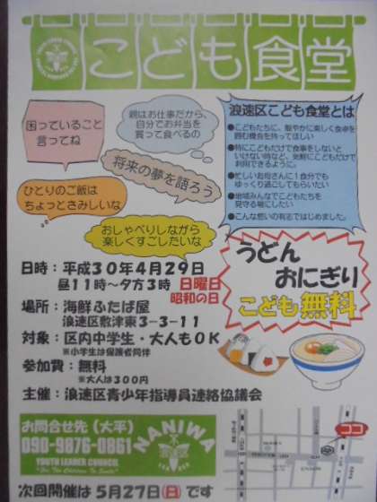 4月29日(日)11:00〜15:00に海鮮ふたば(浪速区敷津東3−3−11)で子ども食堂が開かれます。ぜひ、ご参加ください。