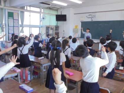 金曜日の朝は、全学年一斉に、短時間の英語学習を行っています。2年2組では、英語でじゃんけん遊びをしています。