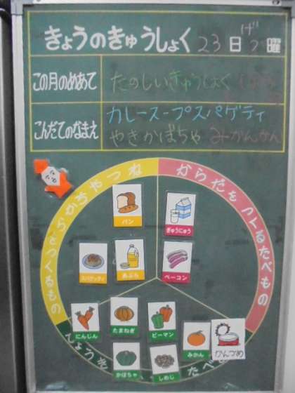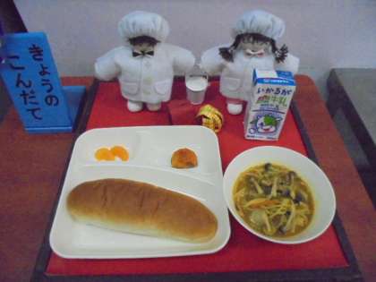 今日の献立は、カレースープスパゲッティ、かぼちゃのバター焼き、みかん(缶)、パン、牛乳です。