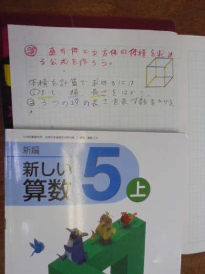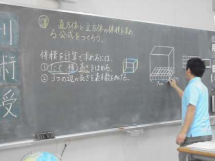 算数で、直方体と立方体の勉強をしています。子どもたちは、集中して学習しています。先生の板書(黒板に書く字や図など)がみごとです!