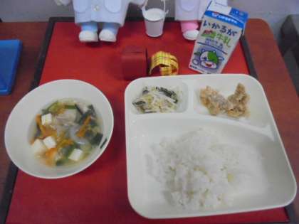 今日の献立は、鶏肉のからあげ、中華スープ、チンゲンサイともやしの甘酢あえ、ごはん、牛乳です。