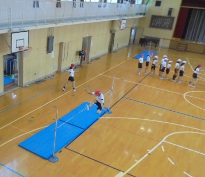 体育館で、走り高跳びをしています。ゴムひもを使って、抵抗が少なくなるよう工夫しています。