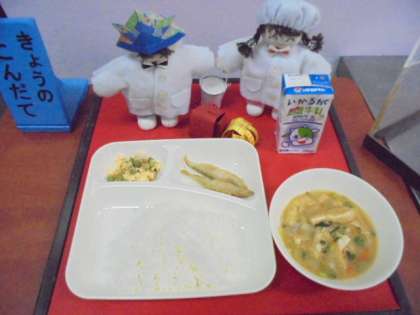 今日の献立は、きびなごてんぷらとみそ汁、えんどうの卵とじ、ごはん、牛乳です。