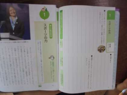 (上)「道徳」の教科書で「スポーツの力」について学習しています。パラリンピック女子陸上選手の佐藤真海選手も登場します。