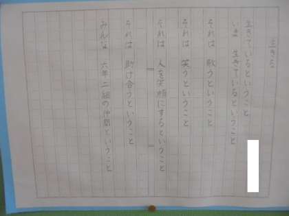(下)「生きる」と題した作文です。すばらしい表現力ですね。