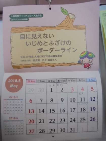 今日5月7日は、「いじめについて考える日」です。全校朝会やそれぞれの学級で、いじめ防止について話し合いました。このカレンダーは、6年生の教室に飾っていたものです。