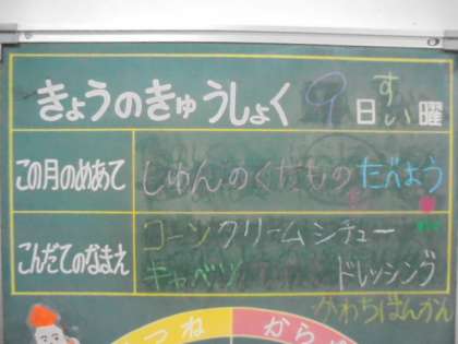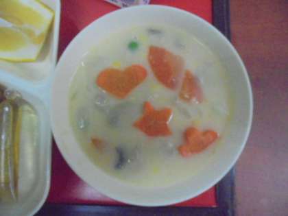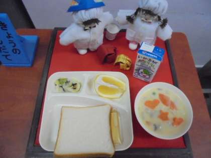 今日の献立は、コーンクリームシチュー、キャベツのひじきドレッシング、河内ばんかん、パン、牛乳です。ラッキーにんじんが入っている幸運の人はだれ?
