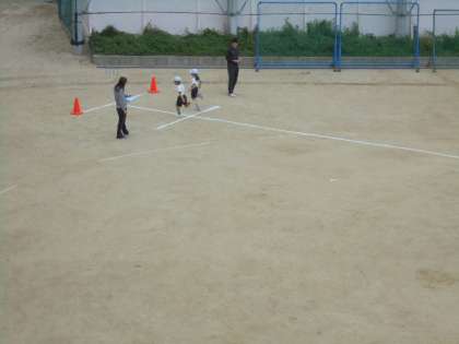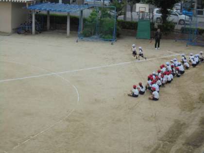 50メートル走をがんばっています!先生方の応援も、熱い!