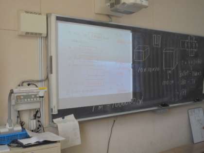 (上)算数の学習です。書画カメラを使って、授業を工夫しています。