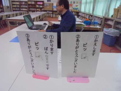 今日は、図書館補助員の小前先生が来られています。本の貸し出しや返却がスムーズになるよう、工夫をしてくださっています。