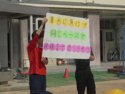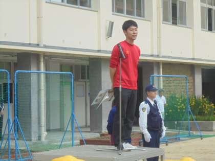 今朝の朝会は、運動場で行いました。汗ばむほどの晴天です。
