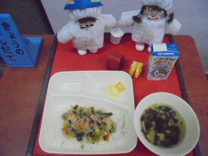 今日の献立は、豚丼、ゆばのすまし汁、焼きじゃが、ごはん、牛乳です。
