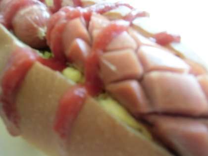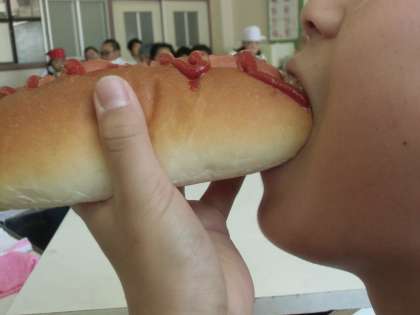 特大ホットドックの出来上がり! 大きなお口でパクリ!!