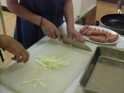 ウィンナーに切込みを入れ、キャベツを太めのせん切りに。