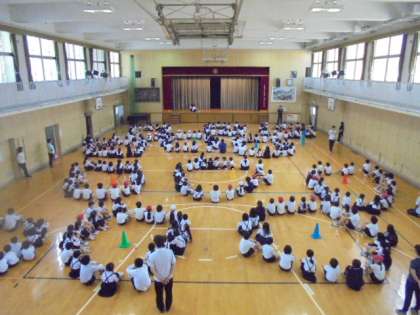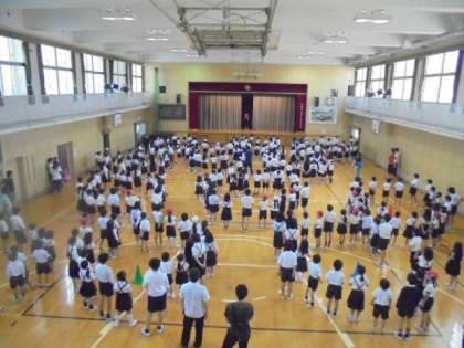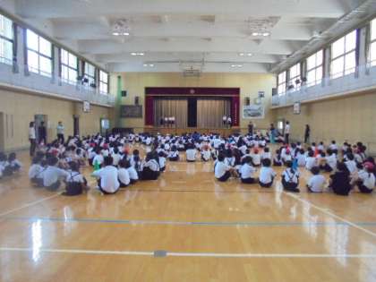 今朝の児童集会は、たてわりグループで、クイズに挑戦です。舞台上の幕間を何かが通ります。さて、何が通ったでしょうか。