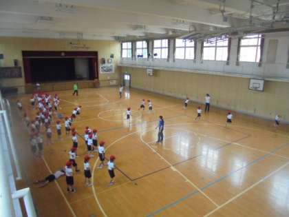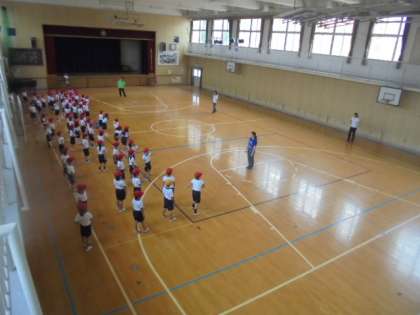 体育館で、ボール投げの練習です。壁に向かってボールを投げ、取りに行きます。