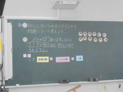 (上)算数の学習です。「何人に分けられますか」