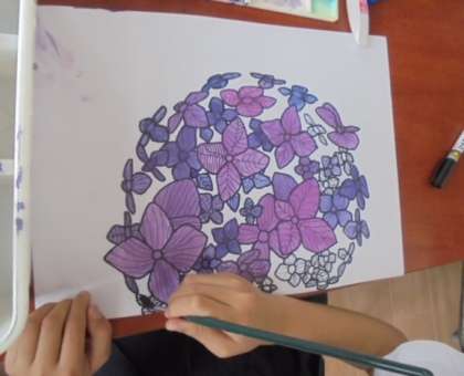 アジサイの下書きに色を塗り始めました。できあがりがとても楽しみです。