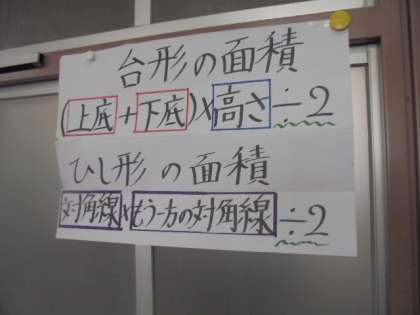 (上)算数の学習で、台形の面積を求める公式です。