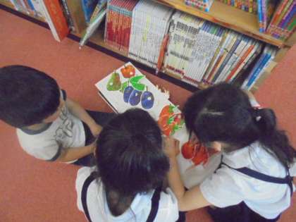 (下)子どもが本の読み聞かせをしています。