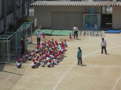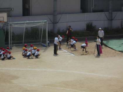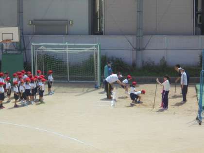 砂場を使って、立ち幅跳びをしています。それ〜!