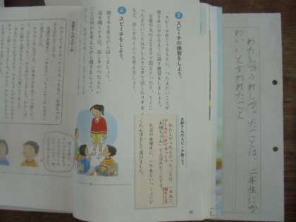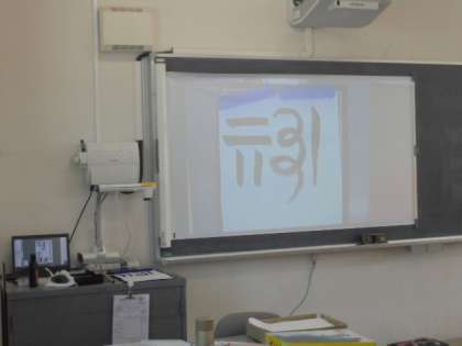 (下)初めての毛筆です。書画カメラを使って説明しています。