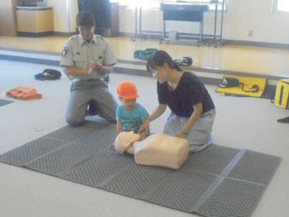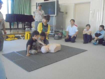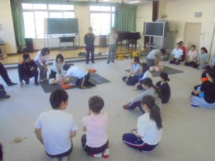 今日の午後4時より、浪速消防署救急隊の皆様にお越しいただき、救命講習会を行いました。呼吸や心臓が止まったときに大切なAEDの使い方を含む心肺蘇生法について、お話を聞き、実習をさせていただきました。教職員のほか、PTAの皆様もご参加いただきました。