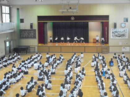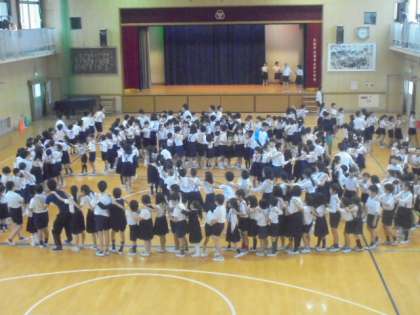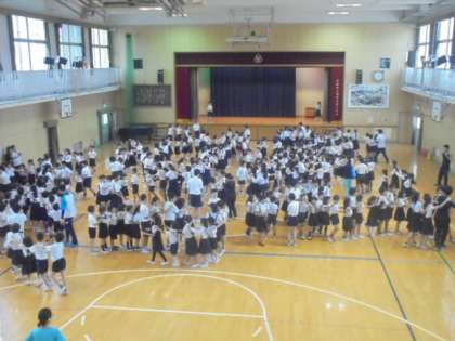今朝の児童集会は、「じゃんけん列車」です。子どもたちと教職員が一緒になって、楽しんでいます。