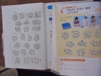 (上)算数で「100より大きい数」について調べています。10のかたまりで考えるとわかりやすいですね。