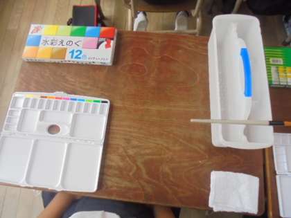 (下)絵の具やパレット、水入れ、筆などの置き方を習っています。