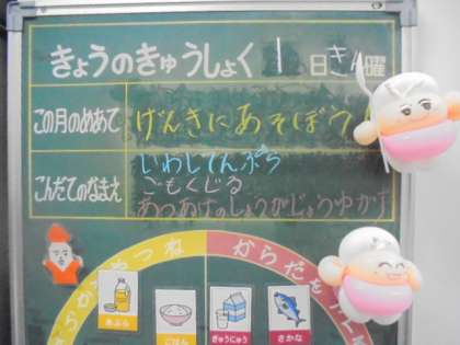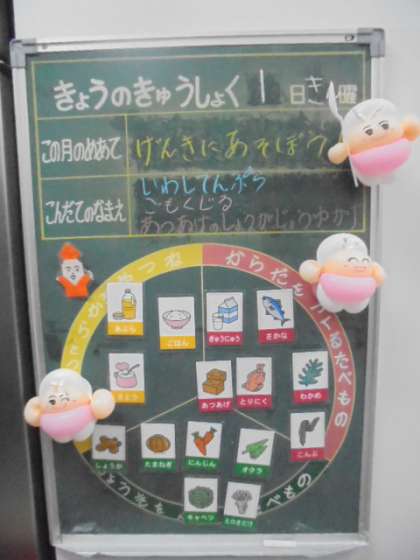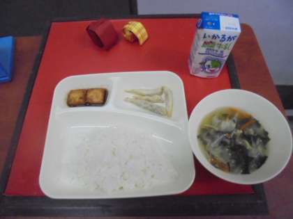 今日の献立は、いわしてんぷらと五目汁、あつあげのしょうがじょうゆかけ、ごはん、牛乳です。給食調理員さんが、かわいらしいバルーンアートを飾ってくださっています!