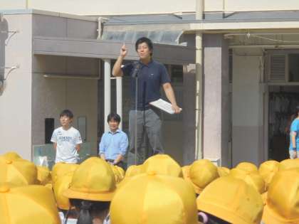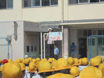 (上)給食主任の鎌田先生から、「食中毒予防」「手洗い」についてお話がありました。
