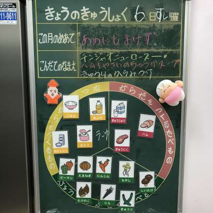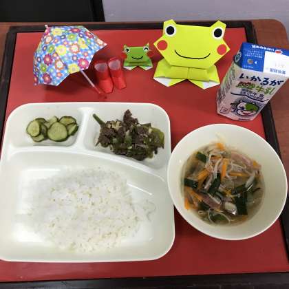 今日の献立は、チンジャオニューロウスー、ハムと野菜の中華スープ、きゅうりの辛みづけ、ごはん、牛乳です。