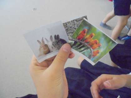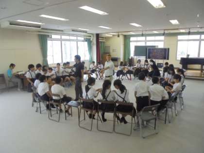 外国語活動の時間です。担任の先生とC−NET(大阪市外国語指導員)が、カードを使って英語に親しませています。