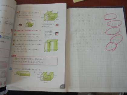 (上)算数の学習です。立体の体積について、勉強しています。