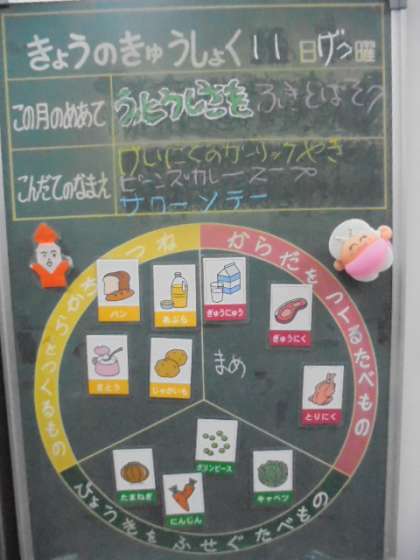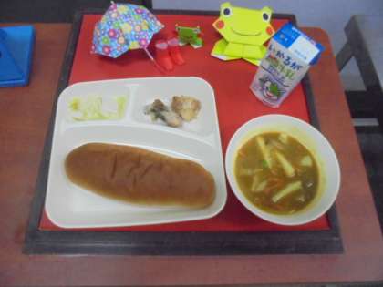 今日の献立は、鶏肉のガーリック焼き、ビーンズカレースープ、サワーソテー、パン、牛乳です。