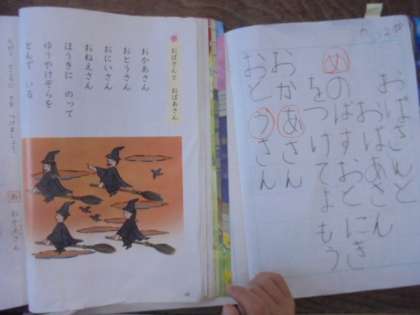 (上)国語で「おばさんとおばあさん」。あとう、いとえの使い分けを勉強しています。