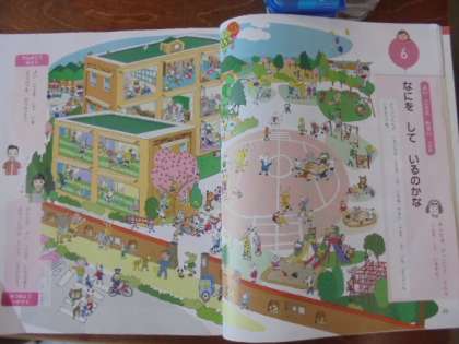 (下)道徳「なにをしているのかな」。絵の中から、よいこととよくないことを見つけています。