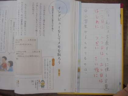 (上)国語の学習です。「インタビューをしてメモを取ろう」