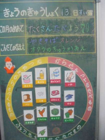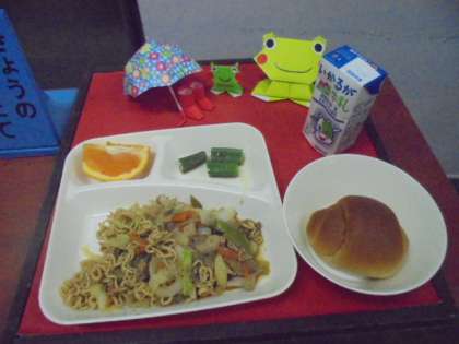 今日の献立は、焼きそば、オクラの中華あえ、オレンジ、パン、牛乳です。給食調理員の皆さんからの温かいメッセージ、いつもありがとうございます。