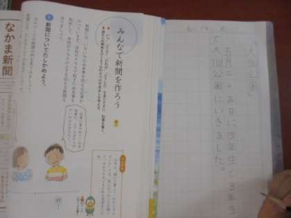 (上)国語で、「みんなで新聞をつくろう」の学習をしています。