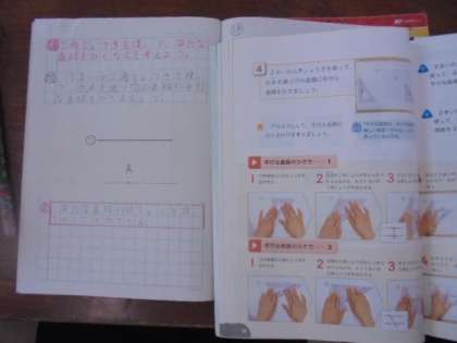 (下)算数の学習です。2枚の三角定規を使って、平行な直線をひいています。