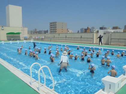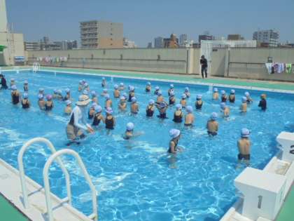 プール開きをしました。リズムに乗って、水慣れをしています。